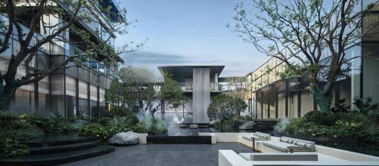 项目以「全球安缦酒店」的隐奢美学为创意,经过「一环两轴三境」的空间规划,以“三境七颂”为笔触,匠造东方精奢园林。两层立体园林借由约4.3米高的地形抬升次序打开,以城市稀有的约9.4米挑高空间为载体,定限制600㎡琉璃光苑,更引约10米巨幕飞瀑吞吐其间,构成「步移景异」的沉溺式体会:清晨在飞瀑边活动,午后在琉璃光苑的藤椅上阅览,黄昏带孩子在花园里漫步……每一步,都是对「诗意日子」的具象化诠释。