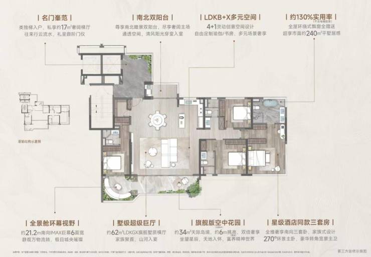 一梯一户规划、全四房南北阔绰格式,超大面宽客厅、创始LDKGX多元同享空间,前所未有至高约130%实用率 (不含电梯前厅),约6米挑高错层式空中浮岛,私享墅质日子,无柱式飘窗坐拥270°环幕视界。