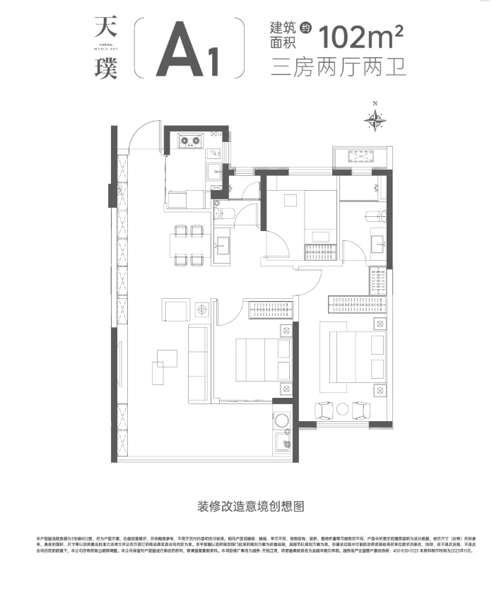 106㎡的改善三居户型,空间阔绰舒适,专为追求品质自然生活的改善型家庭打造。户型采用南北通透设计,空气对流顺畅,室内采光充足,客厅开间达到 4.4 米,空间开阔大气,搭配大尺寸观景窗户,将社区园林的绿意与阳光充分引入室内,让居者在客厅就可以感觉到 “人在画中居” 的美好体验。